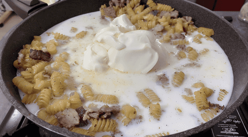 Pasta in creamy sauce with bacon