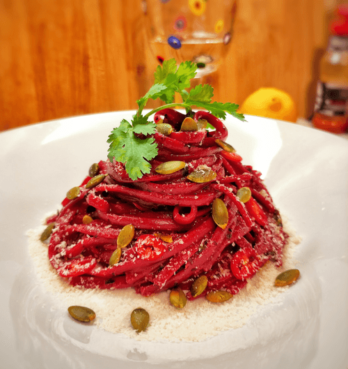 Spaghetti with chili and red wine is a bold and sophisticated dish of Italian cuisine that combines the richness of wine with the spicy heat of chili. This original variation of classic pasta fills the flavor with depth, thanks to caramelized garlic, a hint of sweetness from beets, and the warming aroma of red wine. Subtle notes of spices create harmony, while pumpkin seeds add a pleasant crunch. This dish is perfect for a cozy dinner with a glass of wine and captivates with its elegance. The history of such recipes traces back to the traditions of using wine in Italian gastronomy, where it not only accompanies food but becomes part of it, enriching the taste. Spaghetti with chili and red wine is a choice for connoisseurs of unusual combinations and refined cuisine.