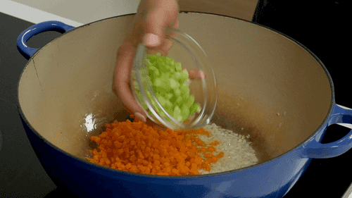 Add carrot and celery to the onion, sautéing and stirring for another 4-5 minutes.