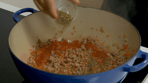 Pour in the passata, add Italian herbs, salt, pepper, and a little sugar. Mix well.