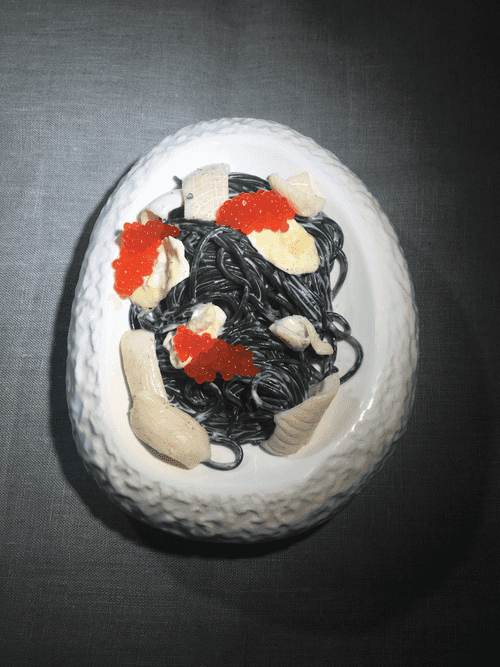 The pasta should be al dente. Mix everything carefully so the pasta absorbs the sauce and place it on a plate. Add a bit of caviar on top. The most important thing is not to overcook the squid to keep it tender and juicy.