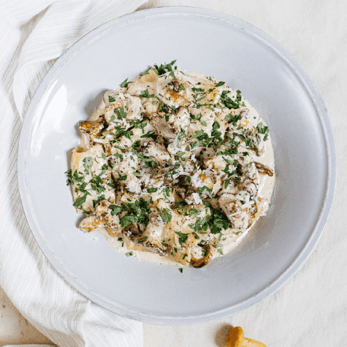 Add cream to the prepared chanterelles. Then add pasta and simmer the cream until it thickens into a sauce.