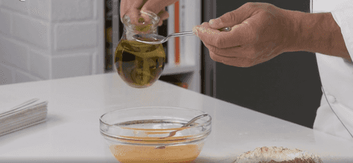Whisk the yolks and eggs in a bowl with olive oil (10 ml) and salt.