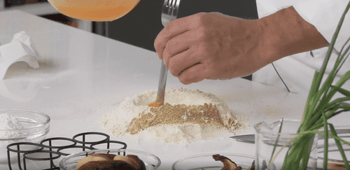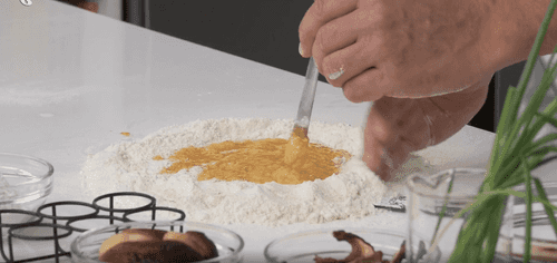 Sift two types of flour together with powdered white mushrooms onto the table.