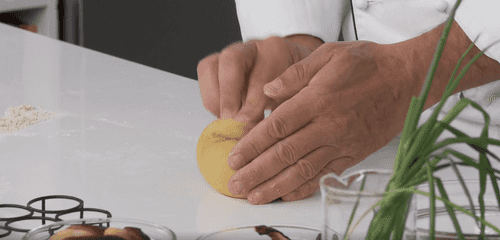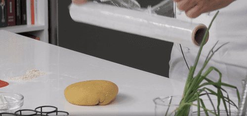 Take the dough out of the fridge, remove the film, and let it warm up for about 10 minutes.