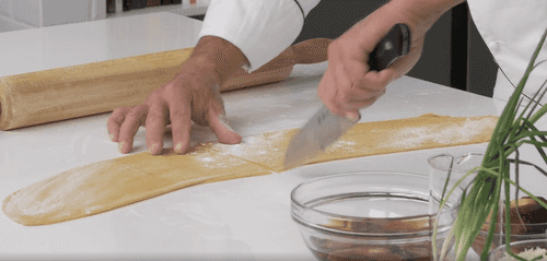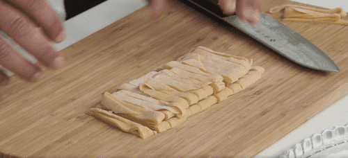 Trim the dough from the sides to create a straight edge, then cut into tagliatelle about 7-10 mm thick.