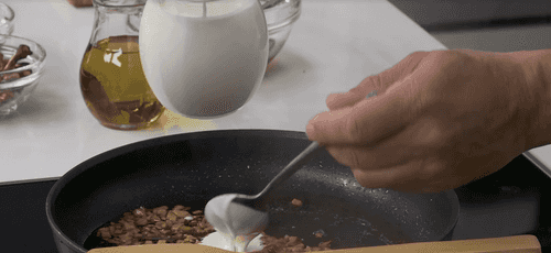 Heat a pan with 1 tbsp of olive oil, lightly sauté the mushrooms, add 4 tbsp of the soaking water. Pour in the cream, mix and reduce to sauce consistency.