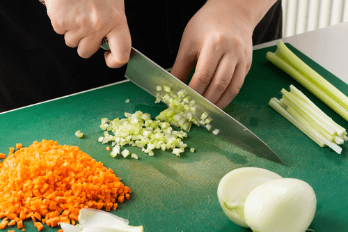 For the stew, first prepare the sauté (sofrito). Dice the onion, carrot, and celery into small cubes. Mince the garlic. Cut the brisket into cubes similar to the vegetables.