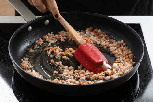 Heat olive oil in a saucepan over high heat and fry the bacon until it releases its aroma into the oil and browns.