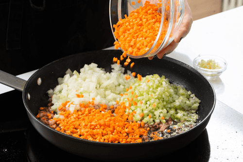 Add onion, carrot, celery, garlic, and a pinch of salt.