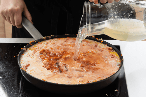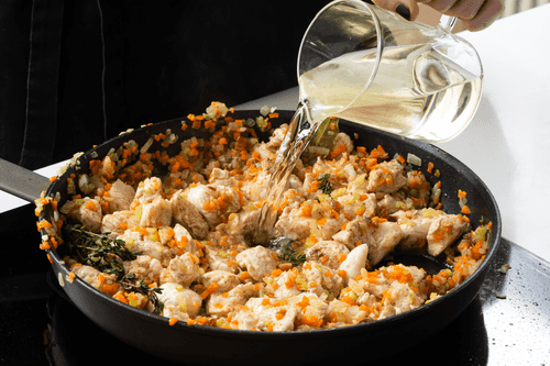Pour wine into the saucepan and let it evaporate.