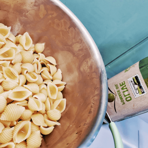 Once the pasta is cooked, drain the water and add a spoon of olive oil.