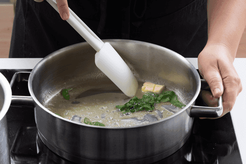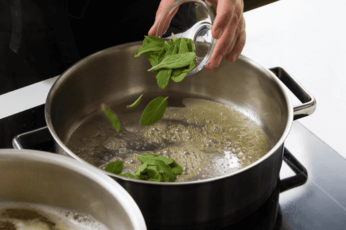 While the pasta is boiling, melt one part of the butter in a pan, add sage and sauté it, but not until brown — the sage should remain dark green.