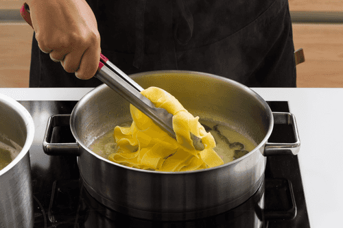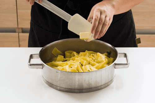 Remove the pan from the heat and stir in the remaining cold butter into the pasta with vigorous bottom-up movements.