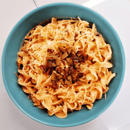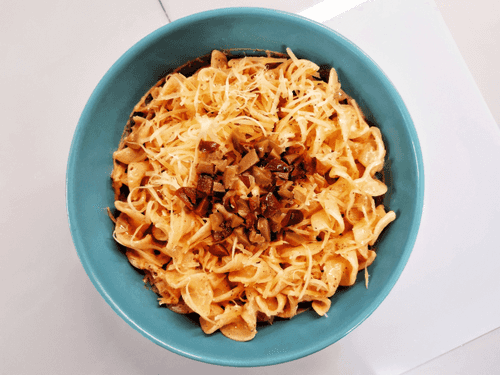 Transfer the pasta to the dish.