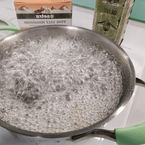 Pour water into the pot and bring to a boil. Add salt and a spoon of olive oil.