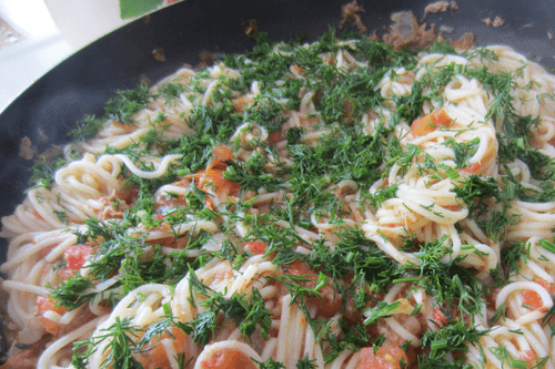 Take the tuna out of the jar, drain the excess oil, and add it to the pan, mashing with a fork and keeping it at a light simmer for 2-3 minutes.