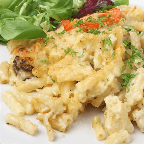 American macaroni is a warm, cozy dish born in the heart of American cuisine, where simplicity meets rich flavor. The recipe is based on tender macaroni soaked in aromatic mushroom broth and milk, giving them softness and depth of taste. The addition of curry brings a slight spiciness, while Gruyère cheese baked to a golden crust turns the dish into a true delight. This dish is perfect for family dinners, warming and providing comfort. It is easy to prepare, and its rich, slightly creamy flavor makes it a favorite among adults and children. It is best served hot, straight from the oven, to enjoy the stretchy cheese and tender texture of the macaroni.