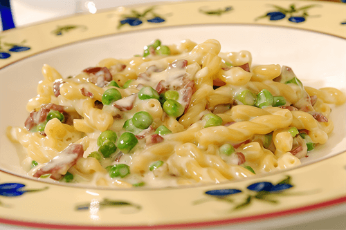Pasta with bacon and peas is a delightful dish of Italian cuisine that combines classic flavors and amazing texture. It originated as a variation of traditional pasta with tomato sauce, where juicy bacon adds richness and sweet peas bring freshness. Gruyère melting in the oven creates an appetizing crust, while aromatic tomato sauce adds rich umami notes. The pasta is perfect for a cozy family dinner or festive gathering, delighting with its combination of softness and slight crunchiness. Bacon fried to golden brown contrasts with the velvety texture of the pasta, creating a harmony of flavors. This dish is not only hearty but also elegant, especially when served with a glass of light red wine and fresh basil leaves.