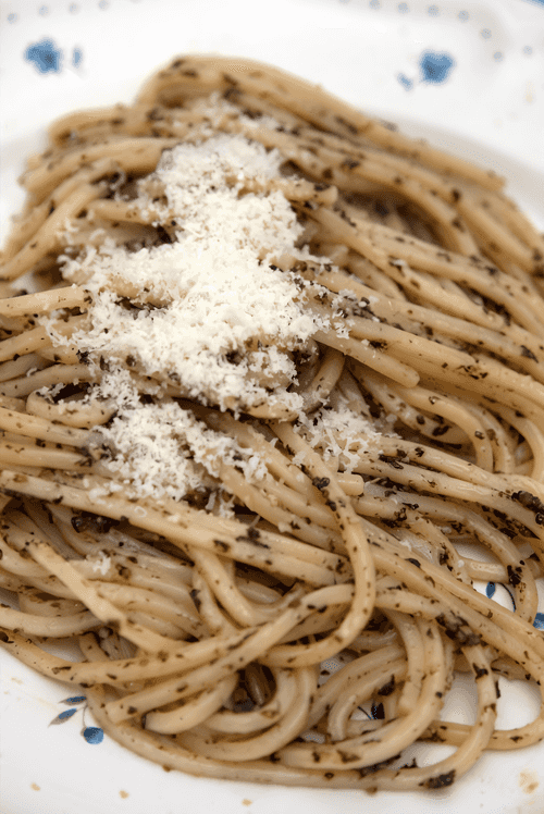 Sprinkle crushed walnuts and grated Parmesan on top. Then, sprinkle the finished dish with truffle shavings.