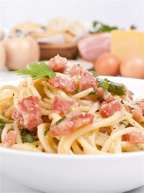 Spaghetti carbonara with parmesan is a classic Italian dish rooted in the shepherding traditions of Lazio. It was originally made from simple and accessible ingredients—eggs, cheese, bacon, and pasta—creating a nutritious and hearty meal. Its flavor is delicate, creamy, with salty notes of bacon and a rich aroma of parmesan. Spaghetti carbonara is perfect for cozy family lunches and exquisite dinners. It doesn't require complex techniques but it's important to quickly combine the hot pasta with the sauce to achieve that velvety texture. The dish is served hot, complemented with freshly ground pepper and an extra serving of cheese. A true delight for lovers of Italian cuisine, it highlights the harmony of simplicity and flavor richness.