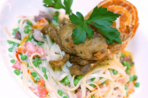 Spaghetti with peas and clams is a refined dish of Italian cuisine that combines the freshness of the sea and the tenderness of pasta. Venus clams, traditional in Mediterranean cooking, add a rich flavor, while white wine enhances their aroma. Green peas contribute a light sweetness and juiciness, creating a balance between seafood and pasta. The sauce made from butter and parmesan makes the dish velvety and rich without overwhelming the taste. This treat is perfect for dinner with a glass of white wine, evoking the feeling of Italy's sunny coast. Serving the hot dish with clams creates an atmosphere of coziness and elegance, making it worthy of any festive table.