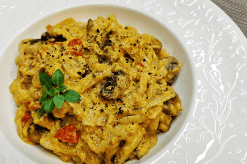 Keto pasta with béarnaise sauce is a refined blend of Italian traditions and a low-carb approach to nutrition. Instead of classic wheat pasta, light shirataki is used, which perfectly absorbs the aromatic béarnaise sauce. Mushrooms add a delicate texture, while cherry tomatoes provide a slight tang and freshness. Sautéed garlic and lime leaves bring spiciness, making the dish's flavor rich and multifaceted. This dish is perfect for those on a keto diet who don't want to give up gourmet cuisine. An ideal option for a cozy dinner where simplicity of ingredients meets elegance in presentation.
