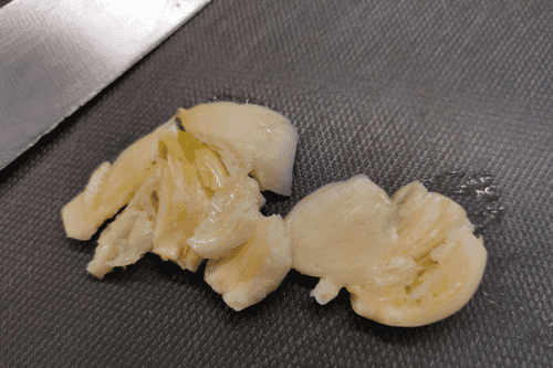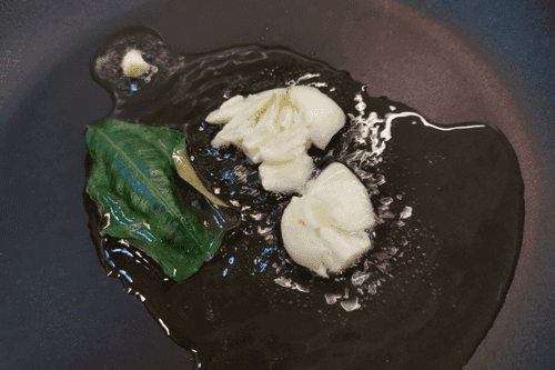 Heat oil in a pan and add garlic and lime leaf. Fry on medium heat for 2 minutes on each side. Then remove.