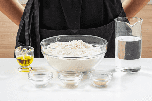 Mix room temperature water, salt, and 2 tablespoons of flour.