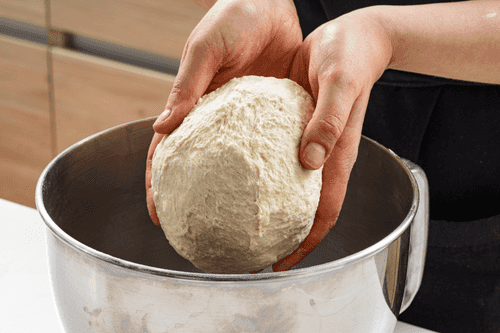 Mix in the remaining flour and knead the dough. The dough can be kneaded by hand or with a stand mixer using a hook attachment.