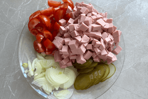 Chop all other filling ingredients: sausage, tomatoes, cucumbers, onion.
