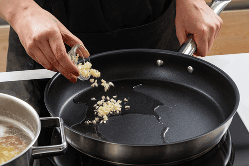 In a large skillet, heat olive oil and sauté garlic for 30 seconds.
