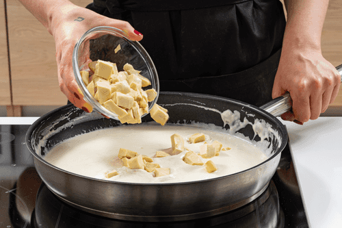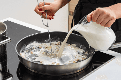 Gradually add plant milk while stirring the sauce with a whisk. Bring to the thickness of liquid sour cream.
