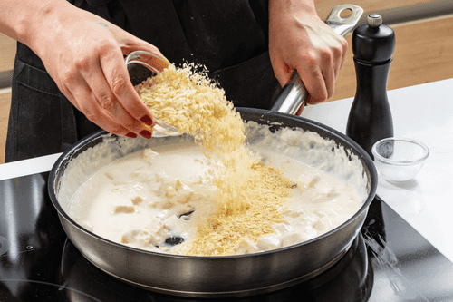 Add salt, pepper, and nutritional yeast to the sauce and mix. If necessary, add a little water from cooking the pasta.