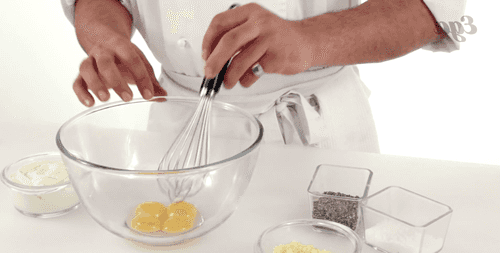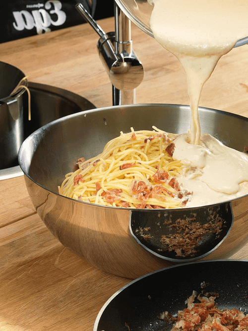 Remove the pan from the heat and in a deep bowl, whisk four egg yolks with cream and grated Parmesan. Season the mixture with salt and pepper, and whisk again.