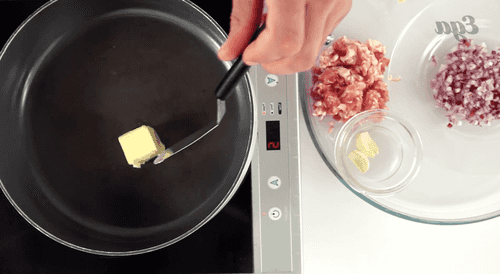 While the pasta is boiling, melt butter in a pan and sauté finely chopped onion, garlic, and bacon until soft and fragrant.