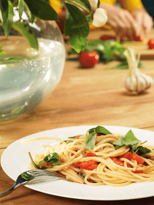 Tear basil leaves into a saucepan and mix them with the pasta. Then serve immediately.