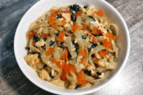Creamy keto pasta with trout and spinach is a refined dish crafted for connoisseurs of delicate and rich flavors. It combines the softness of the creamy sauce, the freshness of spinach, and the rich taste of trout highlighted by rosemary aroma and a hint of lime's acidity. The use of shirataki fettuccine makes this recipe perfect for a keto diet without sacrificing the pleasure of pasta. Adding red caviar gives the dish a touch of luxury, while cherry tomatoes and garlic add spiciness. This is not just dinner; it's a true gastronomic delight that can be served on weekdays or as a special treat. It pairs beautifully with dry white wine, creating an elegant and harmonious dish.