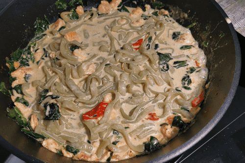 Add the fettuccine to the sauce and stir. Increase the heat slightly and simmer for 2 minutes.
