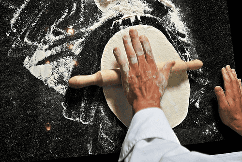 For the test — mix flour, water, olive oil, salt, and yeast. Knead the dough and let it rest in a warm place for 30 minutes. You need 150 g of dough for one pizza.