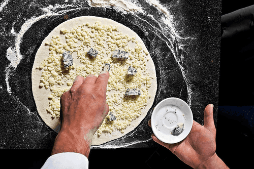 It should be rolled out on a floured surface to a thickness of 1.5 mm. Then, place 120 g of pre-grated mozzarella and small pieces of gorgonzola on the rolled dough. The main thing is not to buy fresh mozzarella for this purpose: it won't be possible to grate it, so you need to choose firm mozzarella suitable for pizza.