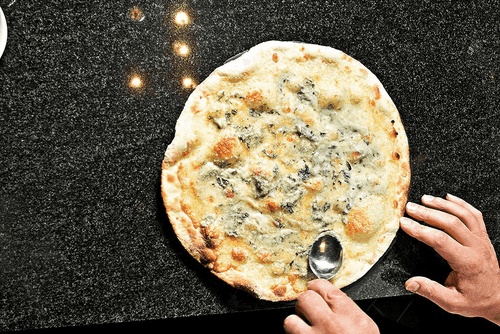 Once the pizza looks ready, you can take it out. Use a tablespoon to spread the melted gorgonzola pieces so that the entire surface of the pizza is covered with a thin layer of cheese. The crust can be left without cheese, or not, at your discretion.