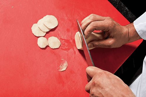 Slice the pear into thin rounds using a sharp knife, preferably a mandoline or slicer. The last two produce even and thinnest rounds, which is what is needed. The core in conference pears is not so tough that it needs to be cut out. The only thing to remove is the seeds if they are encountered while slicing.