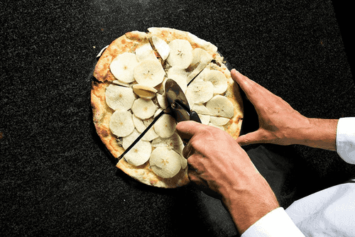 Cut the pizza into six pieces. It's better to do this with a pizza cutter (it has the most suitable handle for this purpose, and the blade is serrated) — the pieces will be even and neat, and most importantly, it will take minimal effort.
