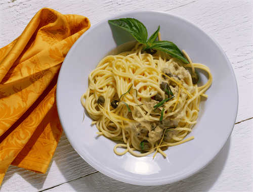 Pasta with tuna and capers is a classic Italian dish that combines the tenderness of tuna with the tangy note of capers. It originated in Italy's coastal regions where fresh tuna was always available. This recipe is perfect for a light yet rich dinner, balancing salty, sweet, and spicy flavors. Capers add a refined taste to the dish, while tomatoes combined with onion and garlic create a fragrant base. Olive oil adds smoothness, and pasta brings all ingredients together harmoniously. The dish is easy to prepare and pairs perfectly with a glass of white wine. It's a choice for those who appreciate simplicity in cooking but want to enjoy authentic Italian flavors.