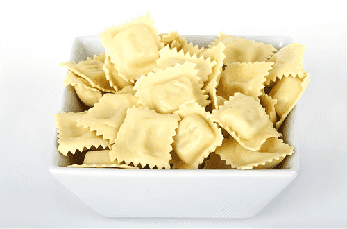 Roll out the dough into 2 thin layers. On one layer, place 2 teaspoons of filling at 6 cm intervals. Brush the space between the filling with egg white, cover with the second layer, press the dough around the filling with your fingers to seal the layers, and cut into separate ravioli with a dough cutter.