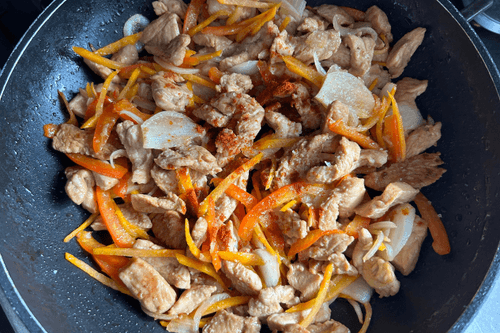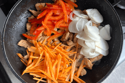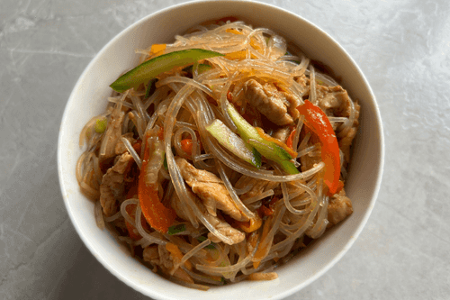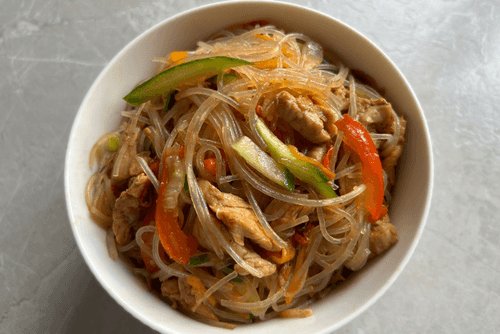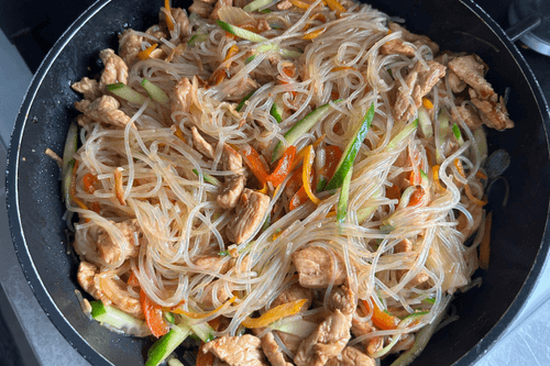 Fried funchosa is a vibrant dish of Pan-Asian cuisine that combines tender turkey fillet, crunchy vegetables, and aromatic spices. Originating from East Asian culinary tradition, funchosa has gained popularity for its versatility and ease of preparation. In this recipe, the transparent noodles absorb soy sauce, enhancing the flavor of juicy turkey, garlic, and smoked paprika. The light tang of fresh cucumber adds zest, while carrot and sweet pepper provide texture. Fried funchosa can be served as a standalone dish or a side. It’s an ideal choice for those who love rich flavors and a balance of healthy ingredients in their diet.