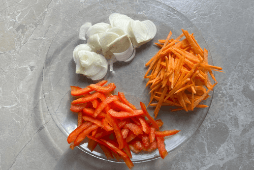 Chop onion, carrot, pepper.