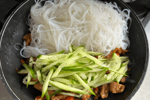 Add cucumber and funchoza to the stir-fry.