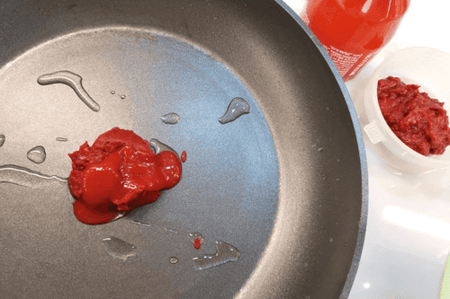Add tomato paste and chili sauce to the heated oil in the frying pan.